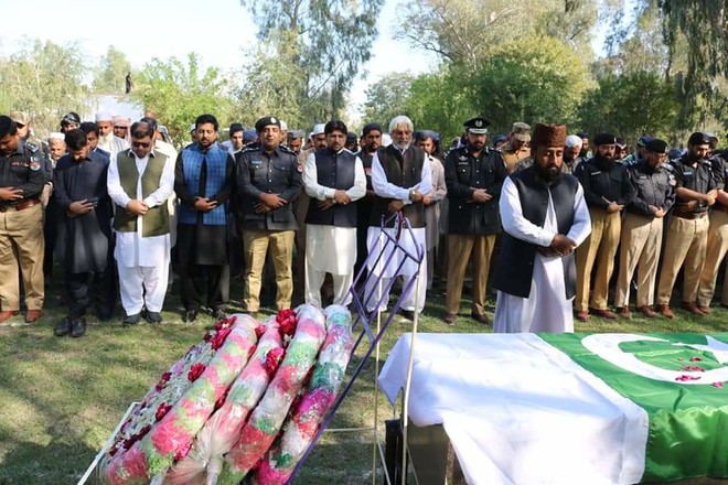 فائرنگ میں شہید ہونے والے کانسٹیبل گل فراز کی نماز جنازہ اعجاز شہید پولیس لائنز ڈیرہ اسماعیل خان میں سرکاری اعزاز کے ساتھ ادا کر دی گئی۔