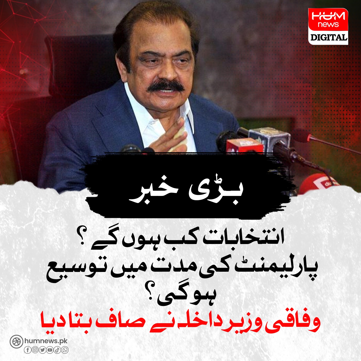 اسلام آباد: وفاقی وزیر داخلہ رانا ثنااللہ نے واضح طور پر کہا ہے کہ پارلیمنٹ کی مدت میں توسیع نہیں ہو گی، عام انتخابات وقت پر ہوں گے، حکومت نے اس کے لیے فنڈز بھی مختص کر دیے ہیں۔