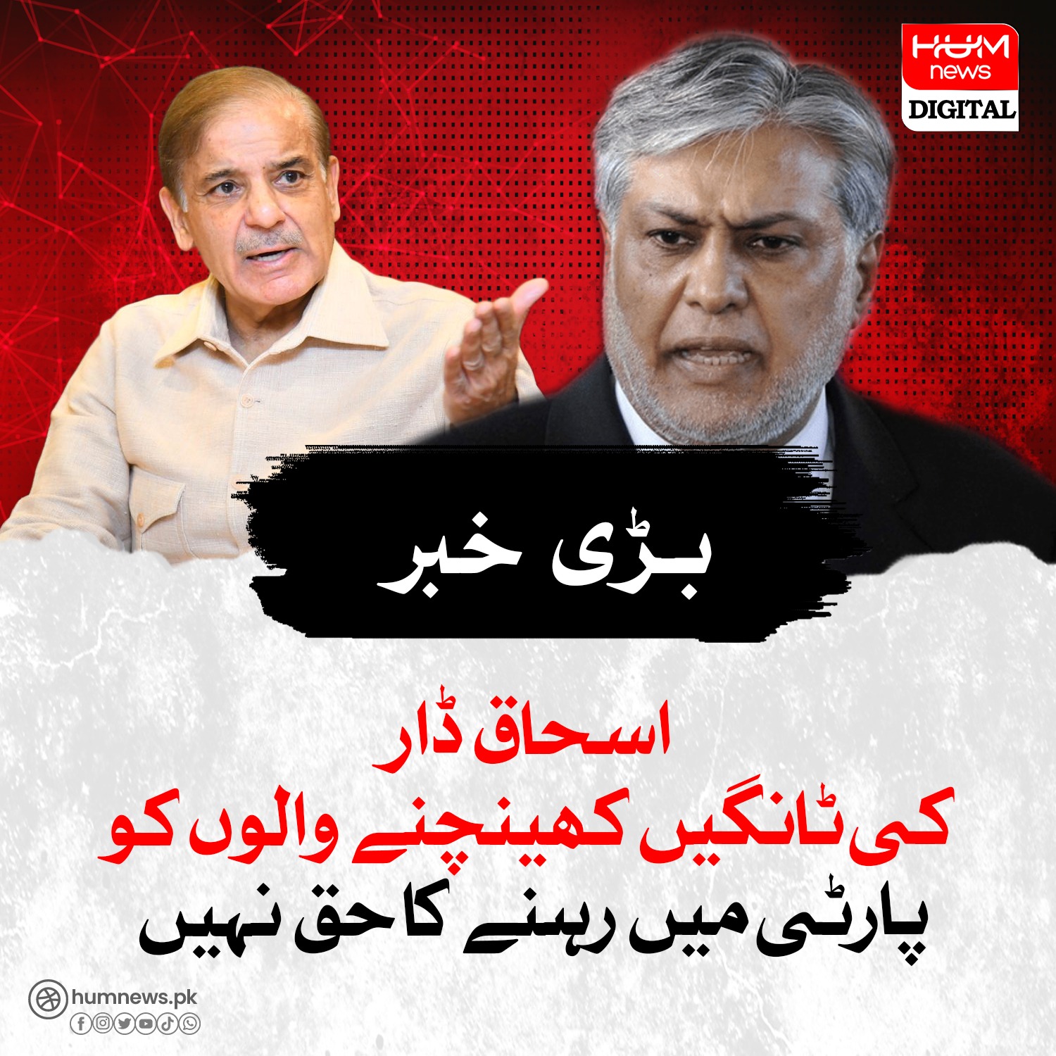 اسلام آباد: وزیر اعظم میاں شہباز شریف نے کہا ہے کہ جو لوگ پارٹی میں رہ کر اسحاق ڈار کی ٹانگیں کھینچ رہے ہیں انہیں پارٹی میں رہنے کا کوئی حق نہیں۔