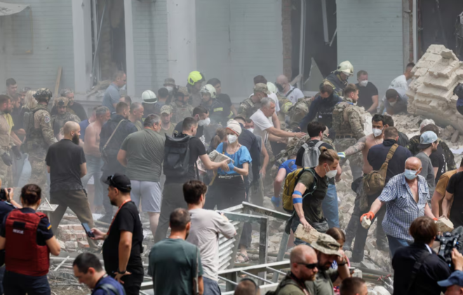 روس نے کیئف میں بچوں کے مرکزی ہسپتال کو میزائل حملے سے اُڑا دیا اور یوکرین کے دیگر شہروں پر میزائل برسائے جس کے نتیجے میں 41 شہری ہلاک ہو گئے۔برطانوی خبر رساں ایجنسی روئٹرز کے مطابق اس فضائی حملے کے بعد والدین اپنے بچوں کو اُٹھائے ہسپتال کے باہر گلیوں میں پھرتے رہے۔ کھڑکیاں ٹوٹ چکی تھیں اور کیئف کے سینکڑوں رہائشی ملبہ صاف کرنے میں مصروف تھے۔