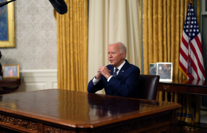 امریکی صدر جو بائیڈن نے ووٹرز سے کہا ہے کہ وہ صدارتی الیکشن میں ملک کی جمہوریت کے دفاع کے لیے نکلیں۔خبر رساں ایجنسی ایسوسی ایٹڈ پریس کے مطابق ڈیموکریٹ پارٹی کے صدارتی اُمیدوار کے طور پر اپنی پوزیشن سے دستبردار ہونے کے بعد جو بائیڈن کا یہ پہلا عوامی خطاب تھا۔امریکی صدر نے اتوار کو اعلان کیا تھا کہ وہ اگلی ٹرم کے لیے الیکشن لڑنے سے دستبردار ہو رہے ہیں جس کے بعد نائب صدر کملا ہیرس اب ڈیموکریٹ پارٹی کی امیدوار بن گئی ہیں۔صدر بائیڈن نے کہا کہ ’جمہوریت کا دفاع کسی بھی عہدے سے زیادہ اہم ہے۔‘انہوں نے خطاب میں سابق صدر اور ری پبلکنز پارٹی کے امیدوار ڈونلڈ ٹرمپ کو براہ راست ٹرمپ کو نہیں پکارا، تاہم اُن کو جمہوریت کے لیے خطرہ قرار دیا۔10 منٹ کے خطاب میں صدر بائیڈن کو ووٹرز اور اپنے حامیوں کے سامنے اپنے دور اور آنے والے دنوں کے بارے میں بات کی۔جو بائیڈن نے کہا کہ ’کچھ بھی نہیں، ہماری جمہوریت کو بچانے کی راہ میں کچھ نہیں آ سکتا۔ اور اس کچھ بھی نہیں میں ذاتی خواہش بھی شامل ہے۔‘ایسوسی ایٹڈ پریس کے مطابق یہ تاریخی لمحہ تھا جب ایک امریکی صدر قوم کے سامنے اپنے جذبات بیان کر رہے تھے کہ وہ رضاکارانہ طور پر اقتدار چھوڑنے کا غیرمعمولی قدم کیوں اٹھا رہے ہیں۔ یہ 1968 کے بعد سے نہیں کیا گیا، جب لنڈن جانسن نے اعلان کیا تھا کہ وہ ویتنام جنگ کے باعث دوبارہ الیکشن نہیں لڑیں گے۔بائیڈن نے صدر کے عہدے کے بارے میں کہا کہ ’میں اس دفتر کا احترام کرتا ہوں۔ لیکن میں اپنے ملک سے زیادہ پیار کرتا ہوں۔‘صدر بائیڈن کا کہنا تھا کہ ’میں نے فیصلہ کیا ہے کہ آگے بڑھنے کا بہترین طریقہ یہ ہے کہ مشعل کو نئی نسل تک پہنچایا جائے۔‘ بائیڈن نے کہا کہ وہ چاہتے ہیں ’نئی اور نوجوان آوازوں‘ کو جگہ دی جائے۔انہوں نے مزید کہا کہ ’یہ ہماری قوم کو متحد کرنے کا بہترین طریقہ ہے۔‘امریکی صدر نے اتوار کو اعلان کیا تھا کہ وہ اگلی ٹرم کے لیے الیکشن لڑنے سے دستبردار ہو رہے ہیں۔ فائل فوٹو: اے ایف پیصدر بائیڈن کا خطاب بڑے براڈکاسٹ اور کیبل نیوز نیٹ ورکس نے براہ راست نشر کیا۔ انہوں نے اپنے عہدے کے آخری چھ ماہ کے کاموں کی ایک لمبی فہرست تیار کی، جس میں 20 جنوری 2025 کو اپنی مدت ختم ہونے تک صدر رہنے پر توجہ مرکوز رکھنے کا عہد کیا۔انہوں نے کہا کہ وہ اسرائیل اور حماس کے درمیان جنگ کے خاتمے کے لیے کام کریں گے۔ غزہ میں، کینسر کے علاج کے لیے حکومتی تعاون کو بڑھانے کے لیے کام کریں گے۔بائیڈن نے کہا کہ امریکہ کے بارے میں سب سے بڑی چیز یہ ہے کہ یہاں بادشاہ اور آمر حکومت نہیں کرتے، لوگ کرتے ہیں. تاریخ آپ کے ہاتھ میں ہے۔ طاقت آپ کے ہاتھ میں ہے۔ امریکہ کا خیال رکھنا آپ کے ہاتھ میں ہے۔‘