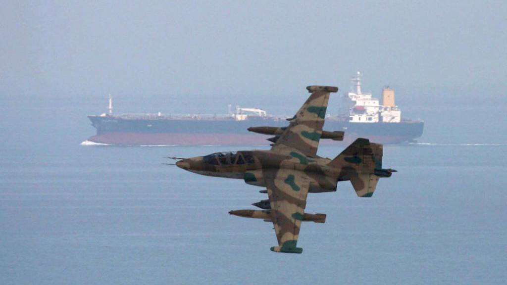 AFP via Getty Imagesآئل ٹینکر کے قریب پرواز کرتا پاسداران انقلاب کا طیارہ (علامتی تصویر)