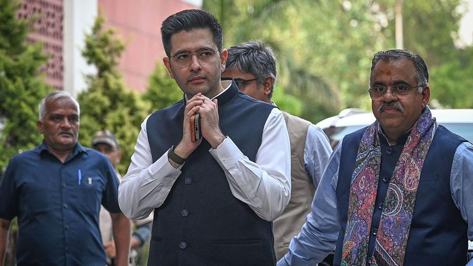 Getty Imagesعام آدمی پارٹی چھوڑ کر بی جے پی میں شامل ہونے والے سات رُکنی گروپ کی قیادت راگھو چڈھا کر رہے ہیں۔ اس تصویر میں سندیپ پاٹھک اور اشوک متل بھی نظر آ رہے ہیں